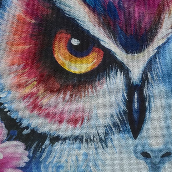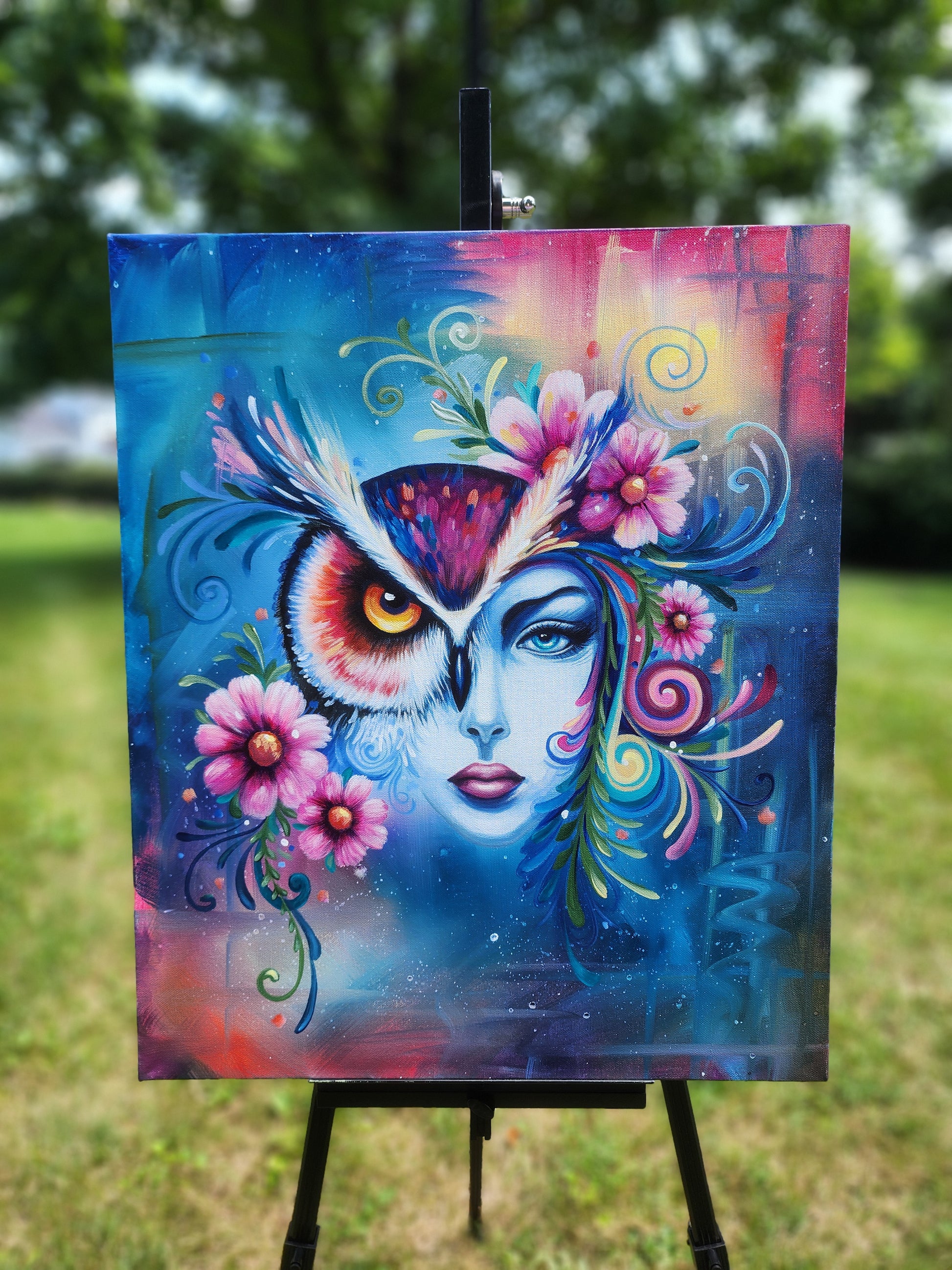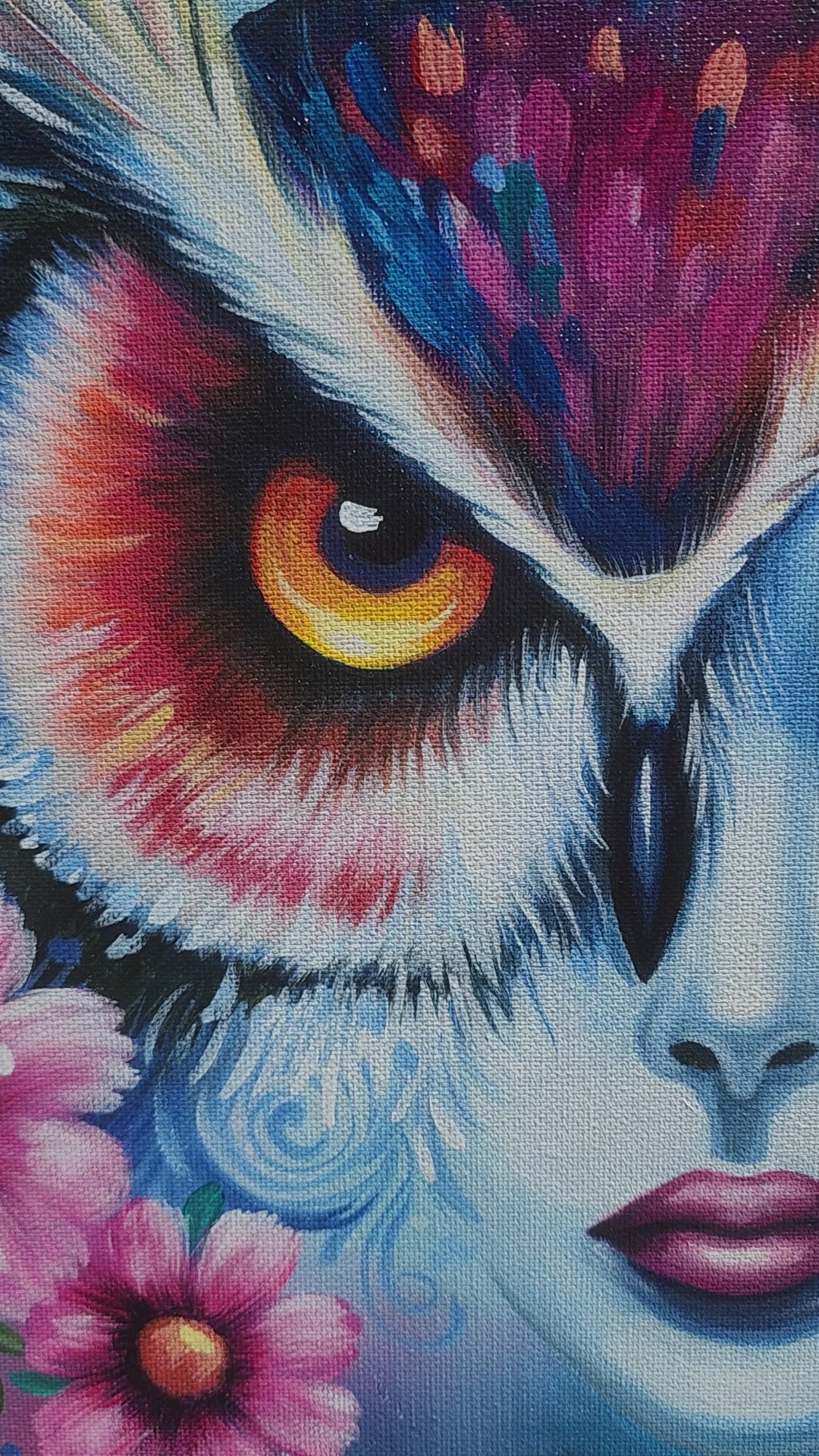 This captivating painting portrays the merging of a woman and an owl, suggesting the profound Interconnection between human and animal - thinking and seeing as One. Owl, a symbol of wisdom and the winds of change, is helping her to see from a Higher Perspective and tap into greater wisdom and intuition to guide her on her path - learning to listen and follow her divine Soul. They are surrounded by the beauty of nature, the energetic swirls of life, and the great beyond, symbolizing expansion and connection to the Universe and All that Is.